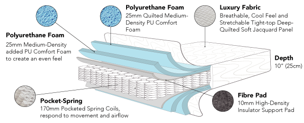 If you are looking for an affordable mattress that is firmer than average, then the Comfort Spring mattress is your preferred choice. It has an individually pocketed-spring inner with multiple layers of PU Foam comfort layers. It is finished with a high-quality breathable fabric with deep quilting. Because of its balance of comfort and affordability, this range is also a popular choice for mid-range hospitality.