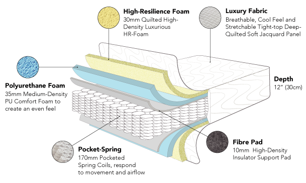 The Hybrid-Spring mattress combines the best of all: a pocketed-spring inner, PU-Foam comfort layers and a top deep-quilt of HR-Foam. This allows the mattress to be in the center of the firmness scale, providing the superior responsiveness of HR-Foam and the silent bounce and support of pocket-spring. It is constructed as a double-sided, 12″ (25cm) deep tight-top mattress, finished with a durable and breathable deep quilted fabric.